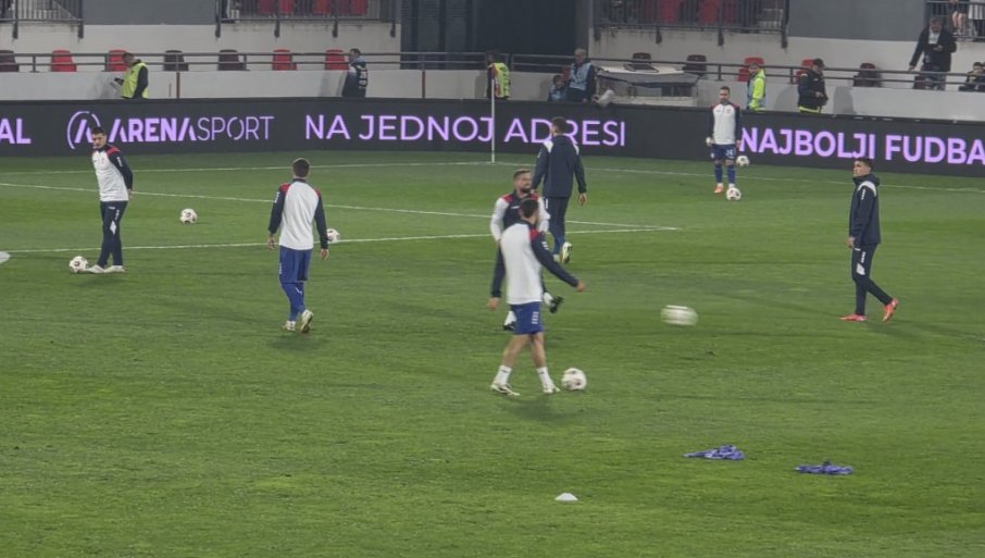 20.28. Igrači oba tima na zagrevanju su, očekuje se uskoro intoniranje himni reprezentacija.