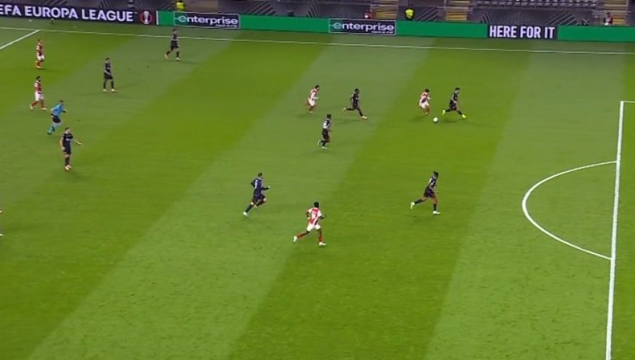 47' - Zvezda je imala korner, odbranili su se domaćini i odmah krenuli u kontru, u kojoj je došlo do prekršaja Tiknizijana, pa će "skraćeni korner" imati Braga s desne strane.