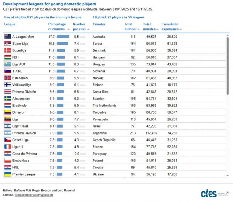 Srpska elitna liga druga je u svetu po broju odigranih minuta fudbalera do 21 godine koji su istovremeno domaći, odnosno reprezentativno podobni igrači.