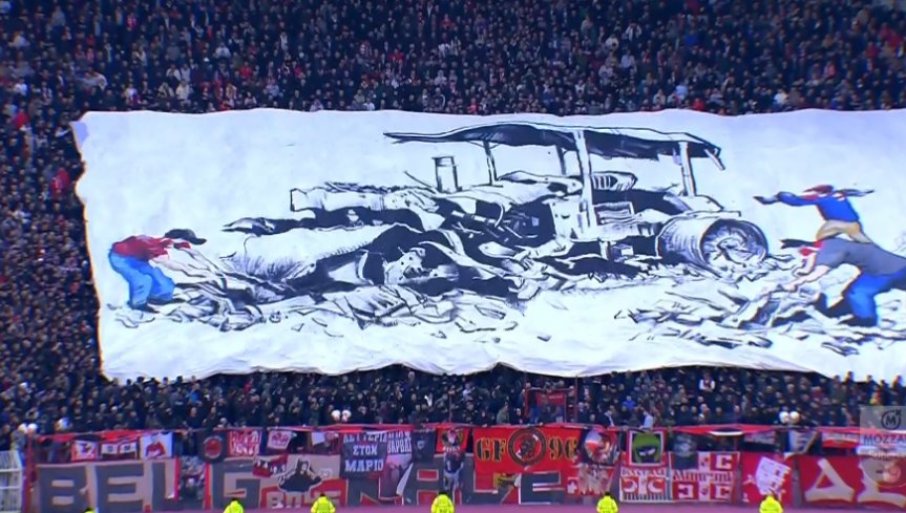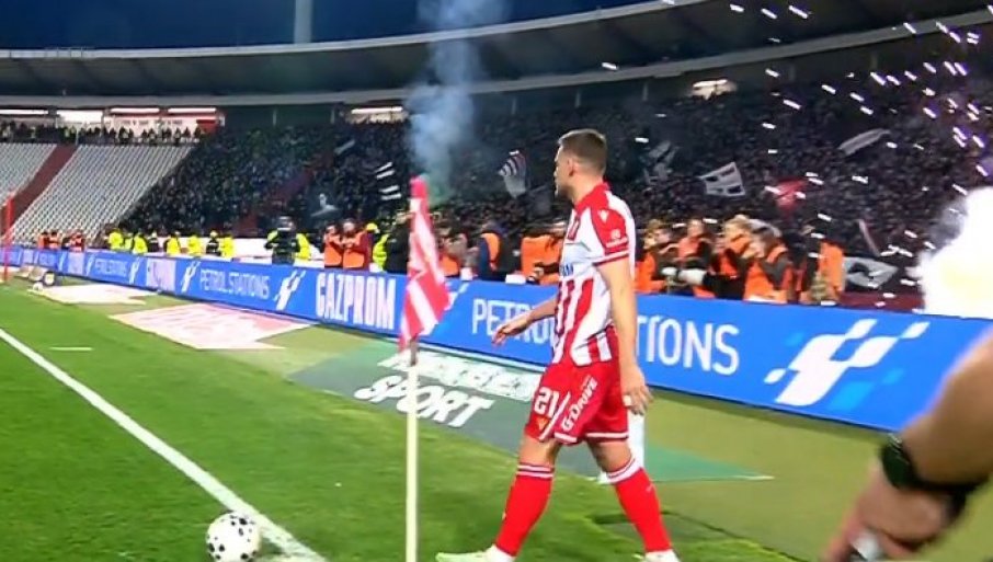 38' - Ponovo "grobari" topovskim udarima pokušavaju da ometaju Zvezdinog igrača koji izvodi korner. Udarac s ugla je ipak izveden, a evo i momenta jedne od pomenutih eksplozija vrlo opasnih i bučnih pirotehničkih sredstava: