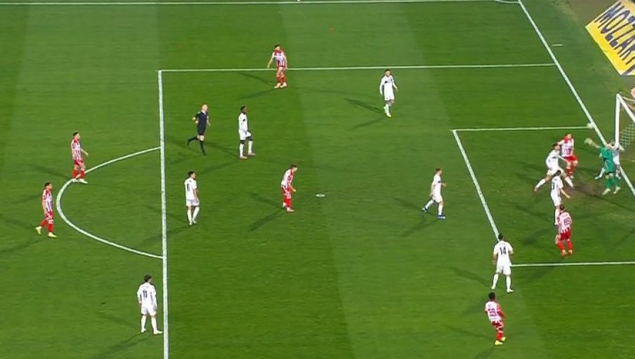 34' - Partizan posle 20-ak minuta od one petominutne presing-dominacije uspeva da na taj način natera Zvezdu na grešku. Sa osmoricom igrača su bili gosti na suparničkoj polovini, uzeli loptu i izborilo slobodnjak s desnog krila. Vukotić je centrirao, a Zvezdini defanzivci interevenisali, makar privremeno.