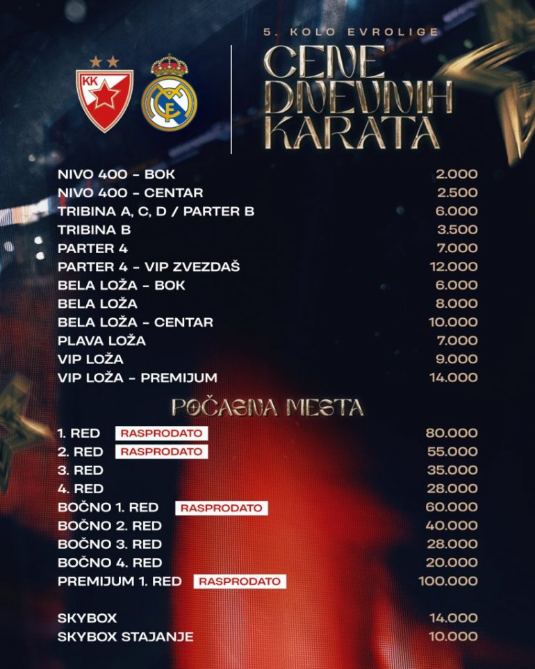 - Prodaja pojedinačkih karata za utakmice 4. i 5. kola Evrolige počinje u petak, 10. oktobra u 12 časova na sajtu tickets.kkcrvenazvezda.rs.