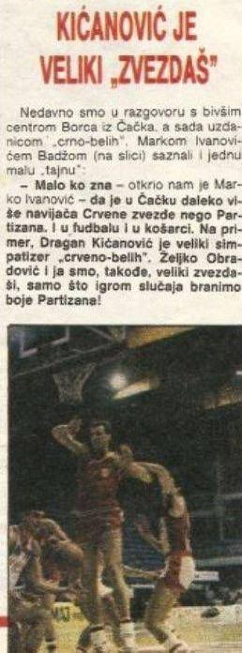- Malo ko zna, otkrio nam je Marko Ivanović - da u Čačku ima daleko više navijača Crvene zvezde nego Partizana. I u fudbalu i u košarci. Na primer, Dragan Kićanović je veliki navijač crveno-belih. Željko Obradović i ja smo takođe veliki navijači Crvene zvezde, samo što se desilo da branimo boje Partizana!", ističe se u starom novinskom članku koji su "delije" objavile uz svoj komentar: