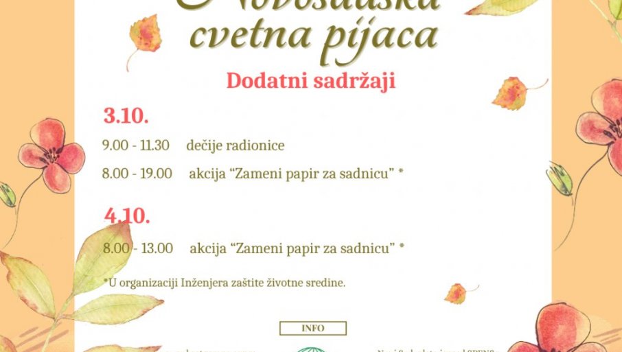 TRADICIONALNA Novosadska cvetna pijaca održaće se u petak i subotu, 3. i 4. oktobra (petak, od 8 do 19 časova;, a u subotu, od 8 do poslepodnevnih časova) na platou ispred JP SPC “Vojvodina” - SPENS U Novom Sadu.