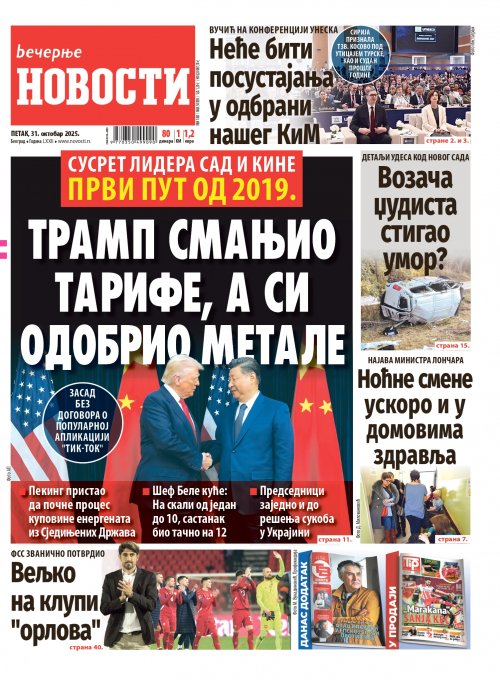 Večernje novosti - Naslovna strana - Štampano izdanje za 31.10.2025.