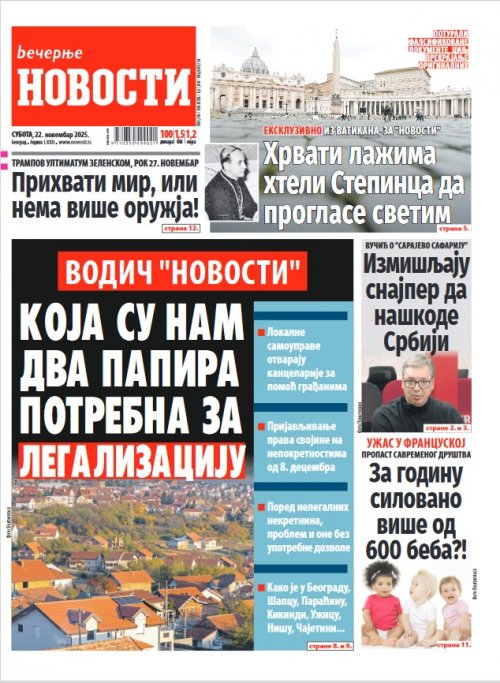 Večernje novosti - Naslovna strana - Štampano izdanje za 22.11.2025.