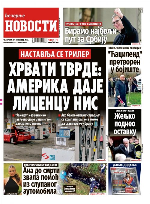Večernje novosti - Naslovna strana - Štampano izdanje za 27.11.2025.