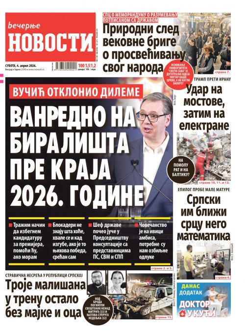 Večernje novosti - Naslovna strana - Štampano izdanje za 04.04.2026.