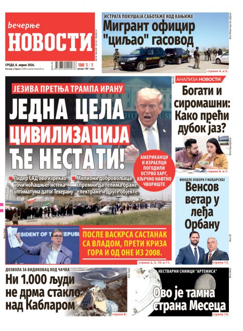 Večernje novosti - Naslovna strana - Štampano izdanje za 08.04.2026.