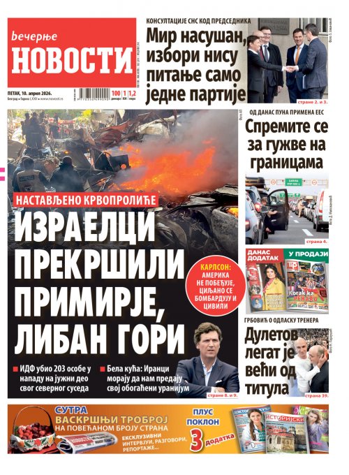 Večernje novosti - Naslovna strana - Štampano izdanje za 10.04.2026.
