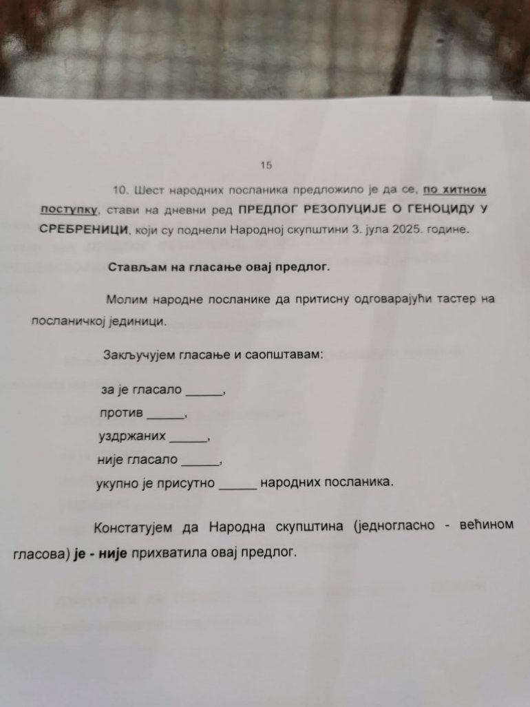 SRAMNO! Ovih šest poslanika glasalo za stavljanje na dnevni red razolucije o genocidu u Srebrenici