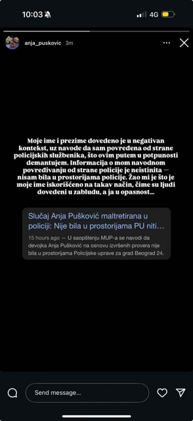 - Moje ime i prezime dovedeno je u negativan kontekst, uz navode da sam povređena od strane policijskih službenika, što ovim putem u potpunosti demantujem. Informacija o mom navodnom povređivanju od strane policije je neistinita - nisam bila u prostorijama policije. Žao mi je što je moje ime iskorišćeno na takav način, čime su ljudi dovedeni u zabludu, a ja u opasnost…