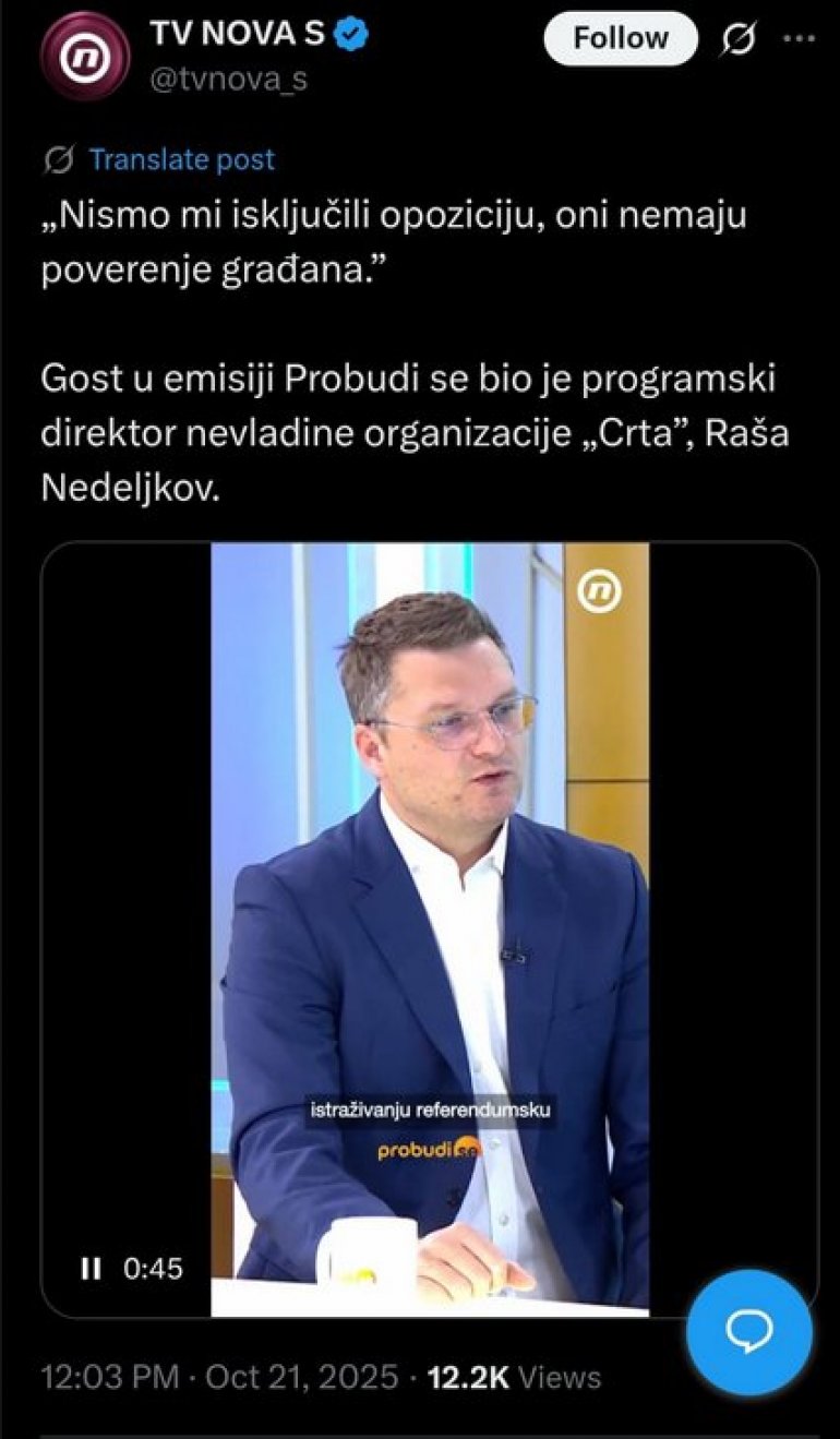 Gost jutarnjeg programa na Nova S "Probudi se" bio je programski direktor CRTA-e Raša nedeljkov koji je prikazao najnovija isttraživanja. Ukratko možda se opozicija i probudi kada shvati da je narod neće. Možda.