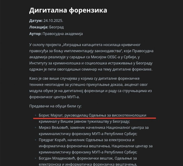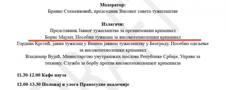 Juče je u okviru Pravosudne akademije održano predavanje pod nazivom „Digitalna forenzika“, gde je Majlat zvanično predstavljen kao „rukovodilac Odeljenja za visokotehnološki kriminal u Višem javnom tužilaštvu u Beogradu“. Na taj način je, po ko zna koji put, obmanuta i stručna i šira javnost, jer se isti naslov pojavljuje i na sajtu Akademije.