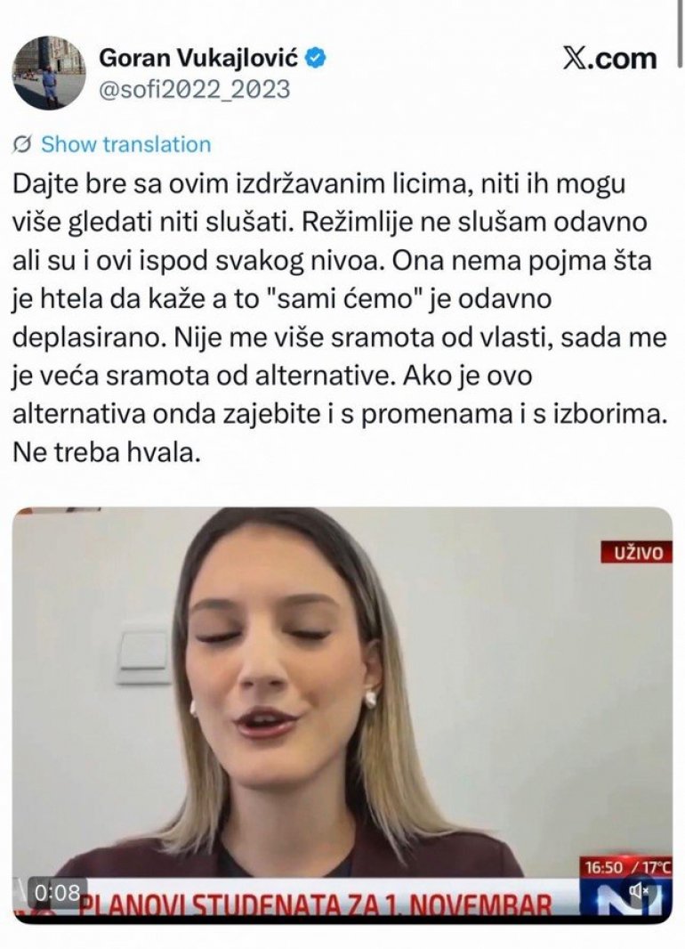 - Dajte bre sa ovim izdržavanim licima, niti ih mogu više gledati niti slušati. Režimlije ne slušam odavno ali su i ovi ispod svakog nivoa. Ona nema pojma šta je htela da kaže a to "sami ćemo" je odavno deplasirano. Nije me više sramota od vlasti, sada me je veća sramota od alternative. Ako je ovo alternativa onda za***ite i s promenama i s izborima. Ne treba hvala - poručio je on.