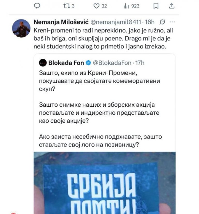 - Zašto ekipo iz Kreni-Promeni pokušavate da svojatate komemorativni skup? Zašto snimke naših i zborskih akcija postavljate i indirektno predstavljate kao svoje akcije? Ako zaista nesebično podržavate, zašto stavljate svoj logo na pozivnicu - navodi se na blokaderskom profilu "Blokada Fon".