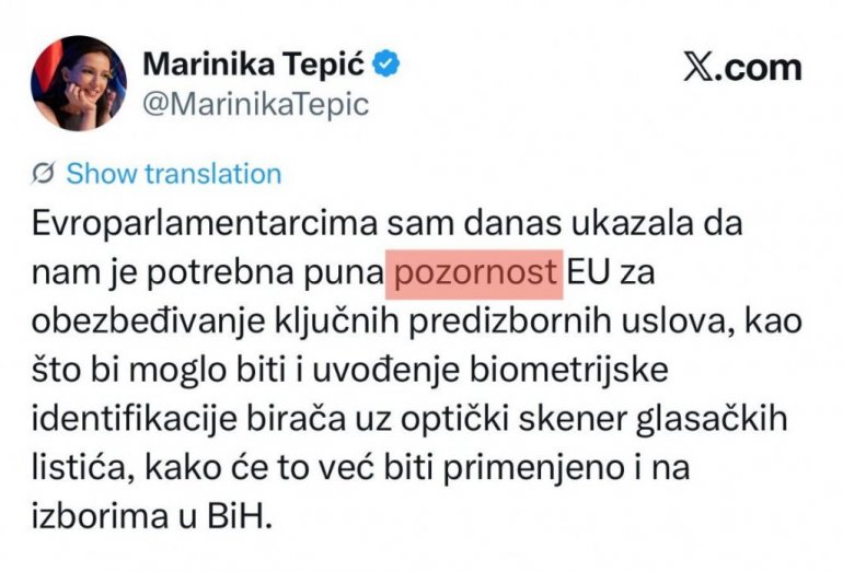 - Evroparlamentarcima sam danas ukazala da nam je potrebna puna pozornost EU za obezbeđivanje ključnih predizbornih uslova, kao što bi moglo biti i uvođenje biometrijske identifikacije birača uz optički skener glasačkih listića, kako će to već biti primenjeno i na izborima u BiH - objavila je Tepić na mreži X.