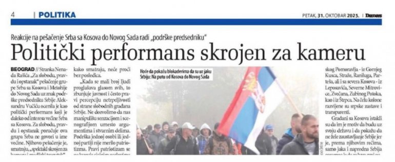 ŠOLAKOV "Danas" preneo je saopštenje stranke Kurtijevog Srbina Nenada Rašića, u kome se marš Srba sa Kosmeta u znak podrške Srbiji, ocenjuje kao "politički performans skrojen za kameru".