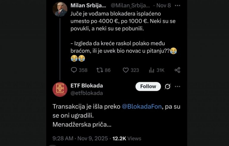 - Juče je vođama blokadera isplaćeno po 4000 evra, po 1000 evra. Neki su se povukli, a neki pobunili. Izgleda da kreće raskol polako među braćom, ili je uvek bio novac u pitanju - piše u objavi.