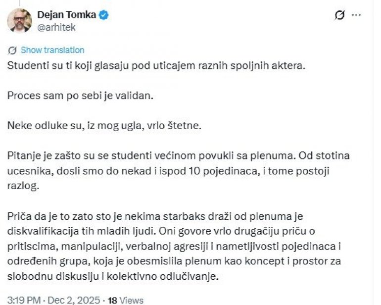 Pitanje je zašto su se studenti većinom povukli sa plenuma. Od stotina učesnika, došli smo do nekad i ispod 10 pojedinaca, i tome postoji razlog.