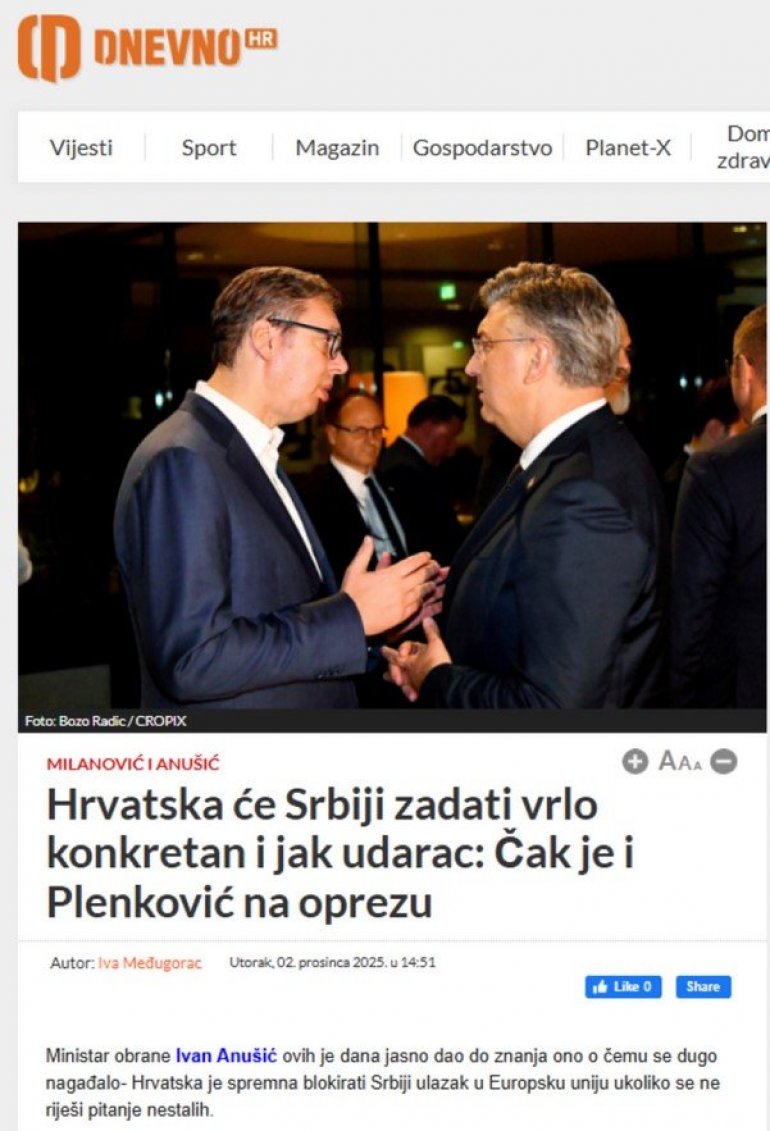 Naime, portal Dnevno.hr objavio je tekst s naslovom"Hrvatska će Srbiji zadati vrlo konkretan i jak udarac" u kom se citira izjava ministra odbrane te zemlje, Ivana Anušića, a u kojoj on otvoreno priznaje kako je Zagreb spreman da "Srbiji blokira ulazak u Evropsku uniju (EU)".