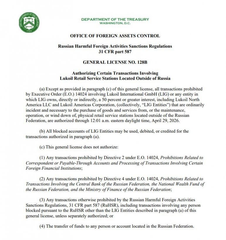 KAKO "Novosti" saznaju Kancelarija za sankcionisanje stranaca Ministarstva finansija SAD (OFAK) produžila je licencu Lukoilu u državama van Ruske Federacije do 26. aprila 2026.