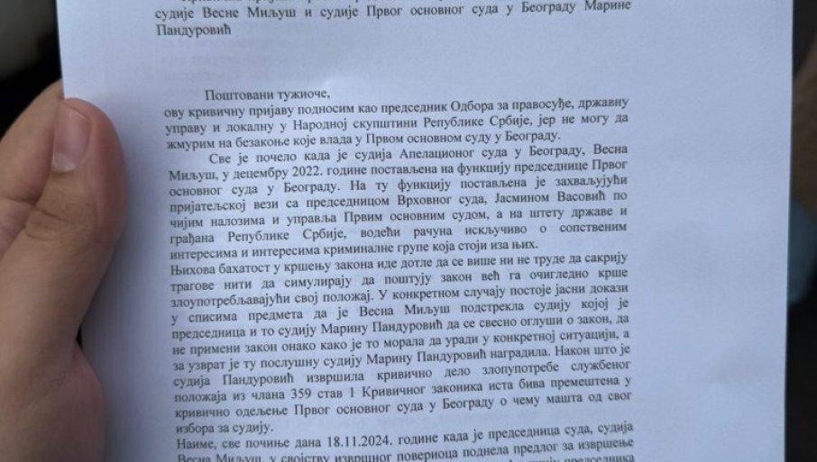 - Ne mogu više da žmurim na bezakonje koje se dešava u Prvom osnovnom sudu u Beogradu, najvećem osnovnom sudu u Srbiji. Sve je počelo kada je sudija Apelacionog suda u Beogradu, pomenuta Vesna Miljuš u decembru 2022. godine postavljena na funkciju predsednika Prvog osnovnog suda u Beogradu. na tu funkciju postavljena je zahvaljujući prijateljskoj vezi sa predsednicom Vrhovnog suda Srbije Jasminom Vasović, po čijim nalozima i Vesna Miljuš upravlja Prvim osnovnim sudom, a na štetu države i građana, vodeći računa isključivo o sopstvenim interesima i interesima kriminalne grupe koja stoji iza njih. Njihova bahatost ide dotle da se više ne trude da sakriju tragove. Postoje jasni dokazi u spisima predmeta da je sudija Vesna Miljuš podstrekla sudiju Marinu Pandurović da se svesno ogluši o zakon, a zauzvrat je tu poslušnu sudiju nagradila. Nakon što je sudija Pandurović izvršila krivično delo, ista biva premeštena u krivično odeljenje, o čemu mašta od svog izbora za sudiju. Više je nego očigledno da je sudija Marina Pandurović nagrađena jer je kršila zakon - izjavio je Mrdić.