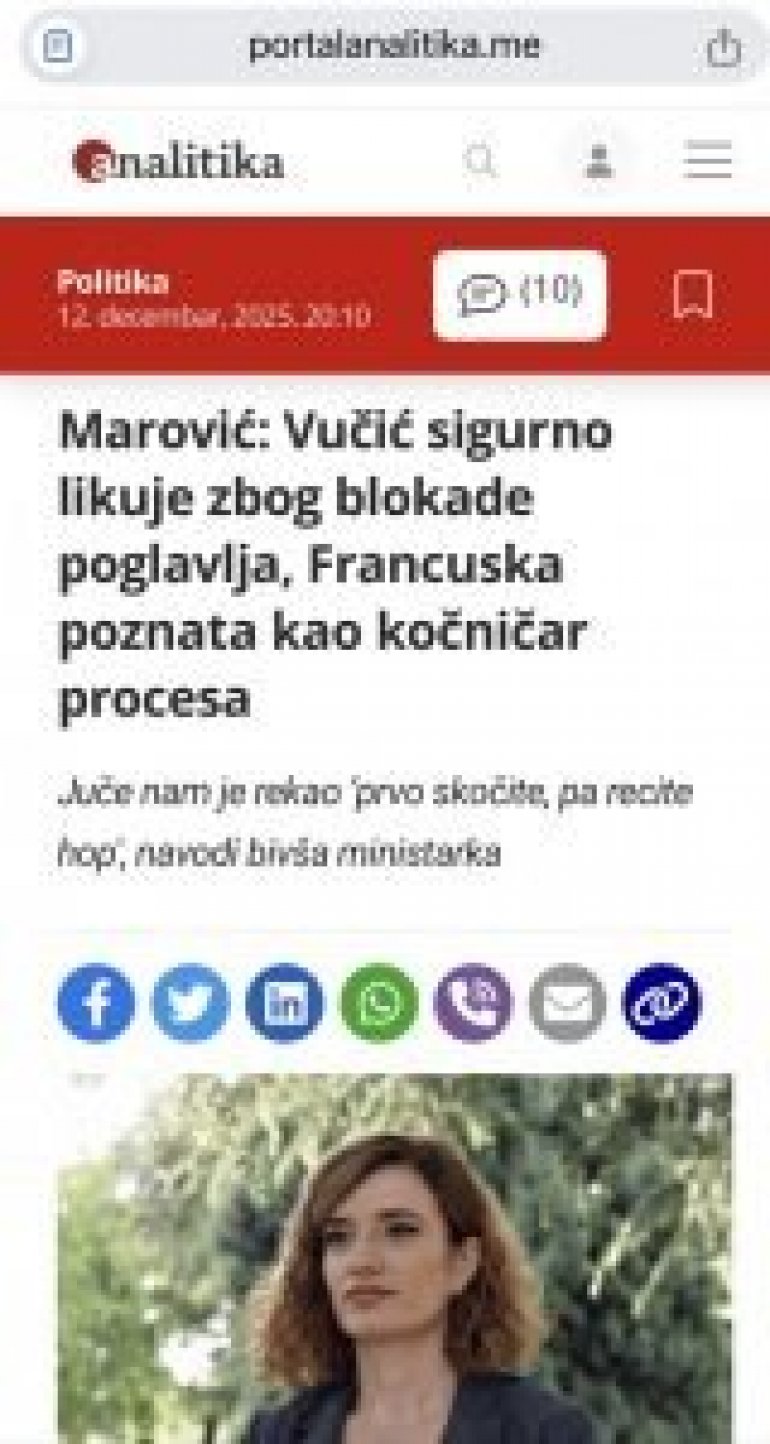 Kao da političko ludilo nije dovoljno duboko, u tu matricu se sada, indirektno ali prepoznatljivo, uključuje i bivša ministarka Jovana Marović, koja svojim javnim nastupima i porukama sugeriše da je i odluka Francuske da ne zatvori dva pregovaračka poglavlja Crnoj Gori – opet, naravno – posledica Vučićevog uticaja. Ne kaže se to direktno, ali se pažljivo ostavlja da „lebdi u vazduhu“, kao još jedan pokušaj da se Briselova poruka o našim slabostima pretvori u priču o tuđem pritisku.