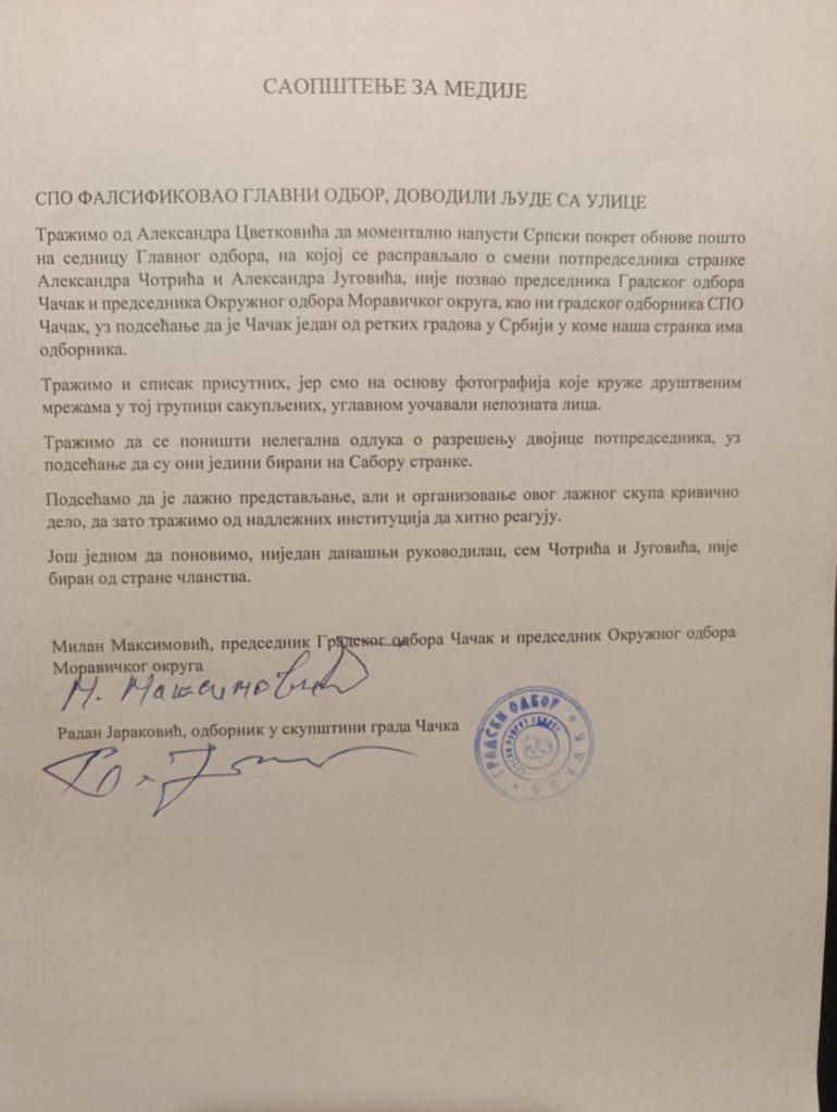 MILAN Maksimović i Radan Jaraković objavili su saopštenje za medije u kojem navode da je stranka Srpski pokret obnove falsifikovala Glavni odbor, i da je dovodila nepoznate ljude.