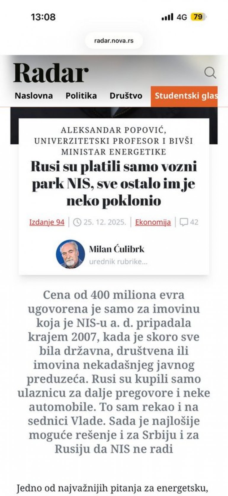 NEDELjNIK "Radar" objavio je vest da su "Rusi platili samo vozni park NIS, sve ostalo im je neko poklonio", te da je ugovorena cena od 400 miliona evra samo za imovinu koja je NIS-u pripadala krajem 2007. godine.