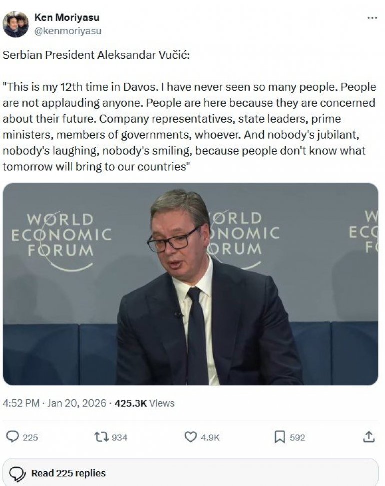 - Ovo je moj dvanaesti put u Davosu. Nikada nisam video ovoliko ljudi. Ljudi nikome ne aplaudiraju. Ljudi su ovde zato što su zabrinuti za svoju budućnost. Predstavnici kompanija, državni lideri, premijeri, članovi vlada - ko god. I niko nije ushićen, niko se ne smeje, niko se ne osmehuje, jer ljudi ne znaju šta će sutra doneti našim zemljama - rečenice su predsednika Vučića u Davosu koje je citirao japanski novinar.