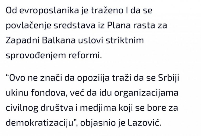 - Od evroposlanika je traženo i da se povlačenje sredstava iz Plana rasta za Zapadni Balkana uslovi striktnim sprovođenjem reformi. Ovo ne znači da opoziija traži da se Srbiji ukinu fondova, već da idu organizacijama civilnog društva i međima koji se bore za demokratizaciju - kazao je Radomir Lazović iz Zeleno-levog fronta.