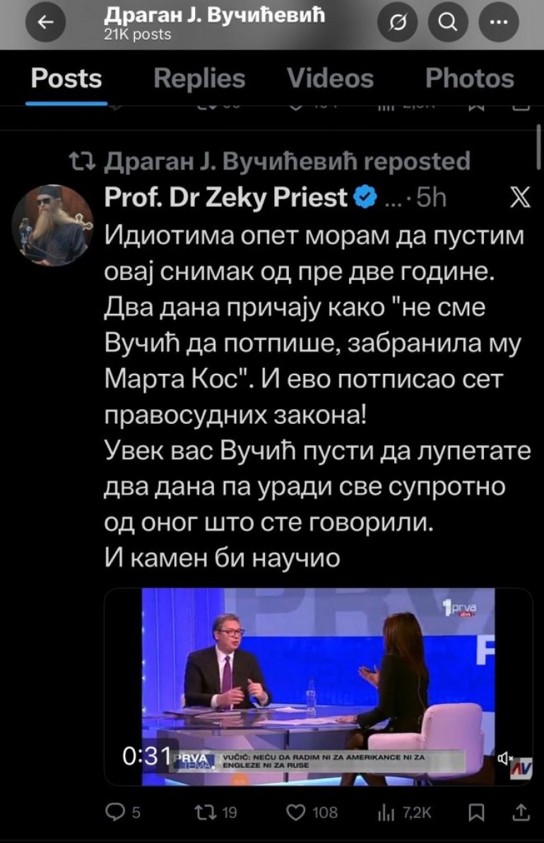 Autor objave podseća da je identičan snimak već ranije kružio javnim prostorom i da se ponavlja ista matrica – dva dana se plasiraju tvrdnje kako je predsedniku Srbije nešto zabranjeno, da mu je neko „vezao ruke“ ili naredio da odustane od odluka, a zatim se desi upravo suprotno.
