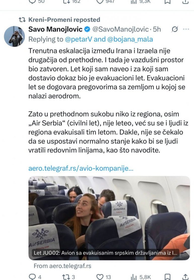 - Trenutna eskalacija između Irana i Izraela nije drugačija od prethodne. I tada je vazdušni prostor bio zatvoren. Let koji sam naveo i za koji sam dostavio dokaz bio je evakuacioni let. Evakuacioni let se dogovara pregovorima sa zemljom u kojoj se nalazi aerodrom.