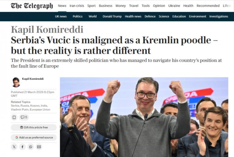 JEDAN od najuticajnijih britanskih medija, Dnevni Telegraf, objavio je tekst o predsedniku Srbije Aleksandru Vučiću u kom je na vanredan način opisana njegova politika, ali i veština predviđanja budućih događaja na osnovu znanja i ogromnog iskustva, pri čemu je posebno naglašeno i to šta je njegova najveća briga.